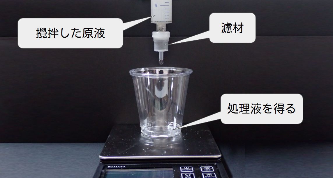 ゼータ電位吸着フィルターなどの除去性能を決める要因が複数あるフィルターは、試してみるまで効果が分かりませんので、お客様の原液をお預かりして弊社で簡易なテストを実施します。